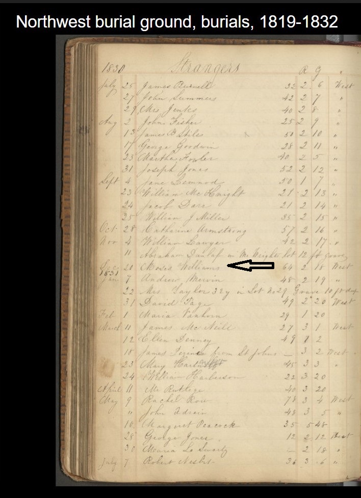 Williams joined the ancestors on December 18, 1830. He was interred at Northwest Burial Ground on December 20, 1830.