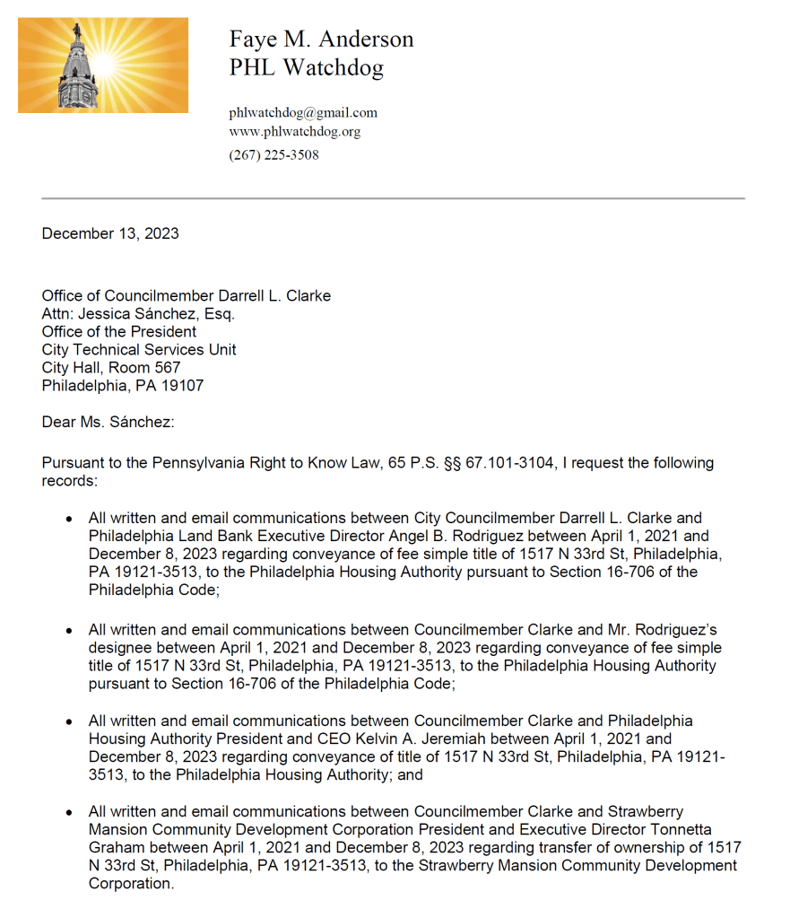 On November 30, 2023, then-City Councilmember Darrell L. Clarke introduced Resolution No. 230905 “authorizing the Philadelphia Land Bank to execute and deliver to the Philadelphia Housing Authority a deed conveying fee simple title to 1517 N. 33rd Street in the Fifth Councilmanic District of the City of Philadelphia pursuant to Section 16-706 of the Philadelphia Code.” Councilmanic prerogative ensured that no Council member would ask why the City is conveying title to a vacant lot to PHA which owns the adjacent property that has been vacant for decades. Instead, the resolution was fast-tracked for final passage on December 14, 2023.
