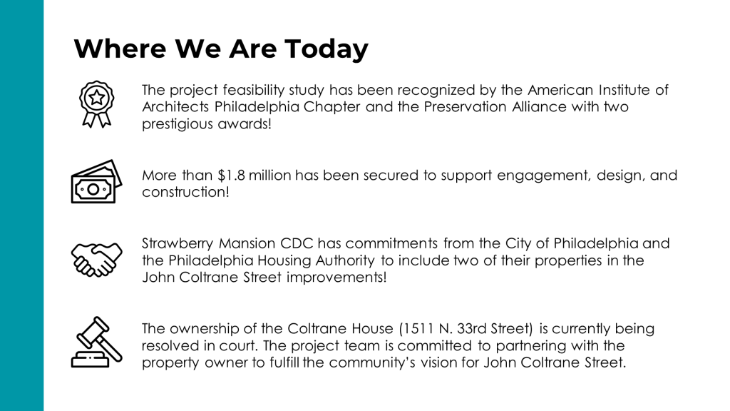 During community events, SMCDC said it “has commitments from the City of Philadelphia and the Philadelphia Housing Authority to include two of their properties in the John Coltrane Street improvements!”
